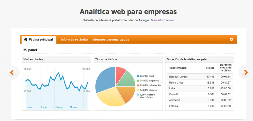 te ofrecemos por defecto las estadísticas principales de visitas a tu página web: número de entradas, número de páginas vistas, procedencia, etc.